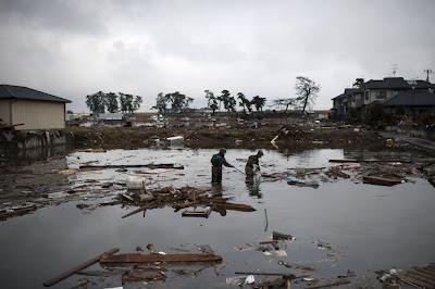 Japanese soldiers check for bodies in the water in Sendai, Miyagi prefecture, on March 16. (Fred Dufour/AFP/Getty Images) |